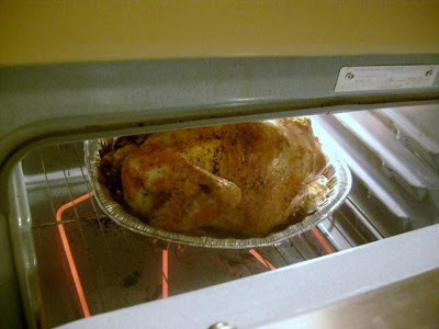 しばらくするとあの独特の匂いがしてきた。なんかくっさ~い。ぎゃ、オーブンを開けてターキーの焼き具合を点検してたら火災探知器が鳴ってしまった!うるさいな! しばらく悪戦苦闘!